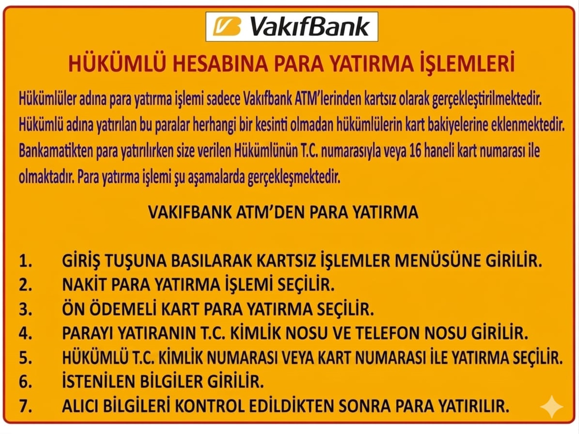 * Hükümlü yakınları Vakıfbank Şube veya ATM’lerinden para yatıracaktır.